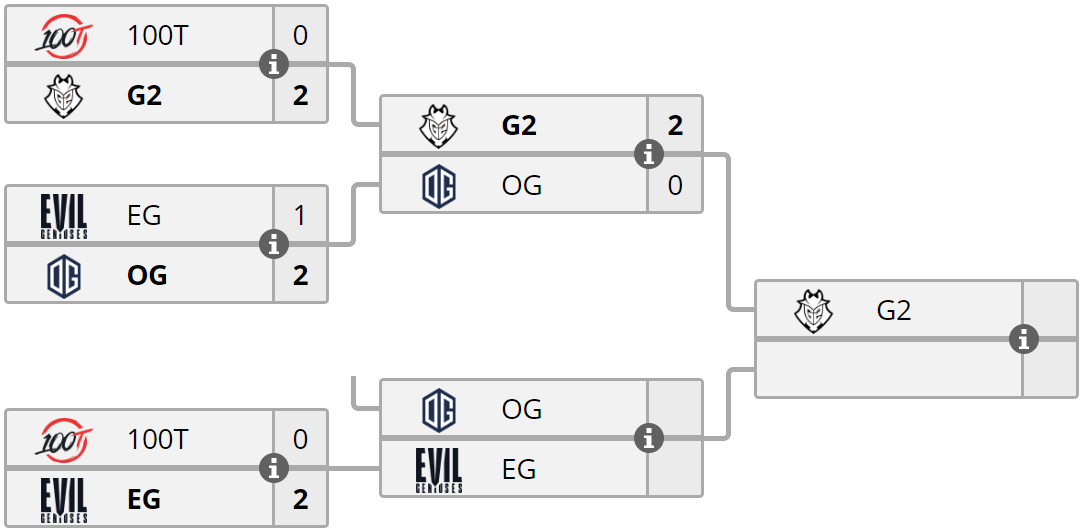 G2 уверенно обыграли OG в финале верхней сетки группы С на BLAST Premier Spring Series 2020 и гарантировали себе участие в заключительной части сезона, что пройдет в Москве. Победителем из полуфинала нижней сетки, в котором столкнулись потерпевшие поражение в стартовых матчах 100 Thieves и Evil Geniuses, вышел североамериканский коллектив. Победитель встречи OG vs. EG, что состоится 16 февраля в 18:30 по московскому времени, пройдет непосредственно в Spring Finals и столкнется с G2 в гранд-финале группы C. Текущие результаты группы C на BLAST Premier Spring Series 2020: P.s У меня есть свой телеграм со ставками на спорт и кибер спорт , залетай пока он бесплатный : https://t.me/sportbetfd