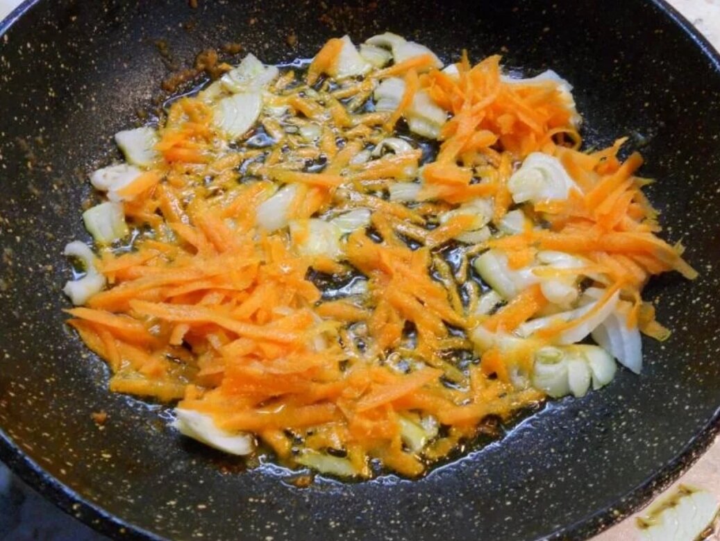 Начнем приготовление со стандартной процедуры. Берем лук и морковь, чистим, нарезаем мелко и тушим 2 минуты на сковороде, добавив растительного масла, 1 ст. ложку воды и специи: куркуму, имбирь и перец по вкусу.