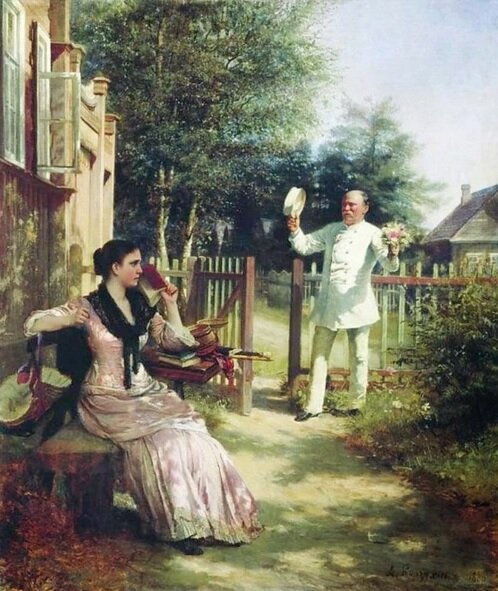 Перед вами картина известного русского художника Алексея Корзухина "Надоел", написанная в 1886 году. Мне она очень нравится своей актуальностью, ведь всегда будут пожилые мужчины, которые бегут ухаживать и свататься не к своим ровесницам, а к молоденьким женщинам. При этом, мужчины абсолютно не ощущают смехотворности ситуации. Сейчас, конечно, немного другое положение, так как богатые пожилые мужчины, ухаживая за барышнями с низкой материальной обеспеченностью, имеют большой шанс получить ответ "да". А тогда такие мужчины чаще всего обращали внимание на ровню, поэтому девушки от них воротили свои хорошенькие личики. У стены дома расположилась молодая женщина. На столике рядом с ней стопка книг. Красавица собиралась отдохнуть за чтением, надеясь, что никто ей не помешает. Но как бы не так! Калитка резко распахивается и навстречу ей с радостно распахнутыми руками и букетом белых цветов идет пожилой мужчина. Он явно старше барышни на три десятка лет. Мне кажется что ей 23-25, а ему за 5