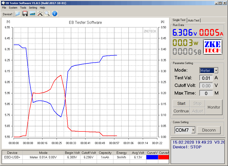 Основным тестом сделать разряд в режиме "постоянное сопротивление" с током 200 мА. Это означает, что 200 mA будет лишь в первую секунду тестирования, а дальше ток будет плавно снижаться по мере разряда батарейки, так, как бы он снижался, если бы нагрузкой был резистор. Специалисты по химии батареек говорят, что в таком режиме и в режиме разряда постоянным током в батарейке происходят совсем разные процессы, а большинство устройств на батарейках не содержат стабилизаторов и их потребление снижается по мере разряда, так что такой тест будет лучше отражать работу батареек с реальной нагрузкой.