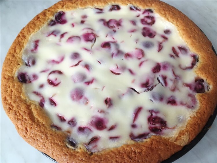 Ингредиенты: Для крема: Способ приготовления: 1) Муку, разрыхлитель, соль смешать. 2) Отдельно взбить 200 г сахара , 2 яйца, 200 г маргарина и 200 г сметаны и постепенно всыпать муку и замесить тесто. 3) Раскатать его трудно, прямо целыми куском положить на противень и ладонью, смоченной в яйце, распластать так, чтобы лежало ровно и чтобы края на борта противня заходили. 4) На тесто положить свежие вишни, из которых заранее вынуть косточки и сок успел немного стечь. 5) Сверху залить сметанным кремом ( 400 г сметаны взбить со столовой ложкой крахмала и сахаром). 6) Сразу же поставить в горячую духовку при температуре 190 - 200 °C на 30 минут. ПРИЯТНОГО АППЕТИТА!!!