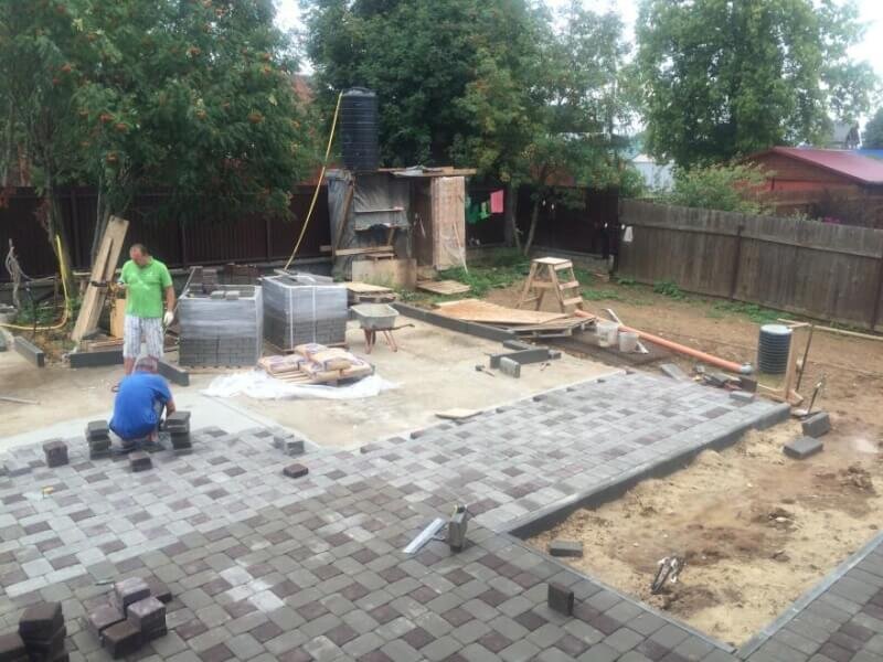 - Мощёные участки. В данном случае на уже подготовленное основание выполняется укладка тротуарной плитки. Оно может быть любого типа (песчаным или бетонным). Различные размеры и цветовые оттенки плитки позволят вам выбрать любой понравившийся вариант конкретно для вашего участка, опираясь на ваши предпочтения.