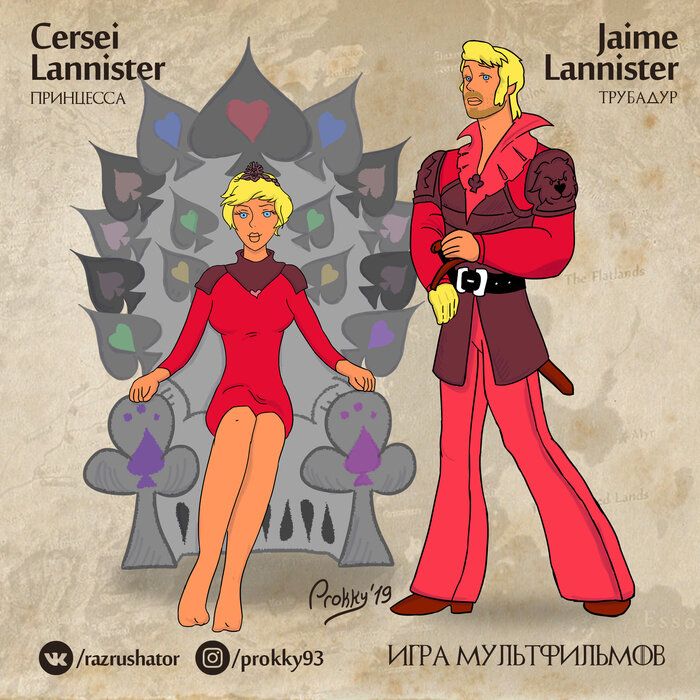 ⚔ Как пел классик — show must go on. Представляю вторую часть картинок с персонажами «Союзмультфильма», перевоплотившихся в героев «Игры престолов». Первую часть вы можете посмотреть на Пикабу или в любом другом месте Интернета. При создании второй части в том числе были использованы идеи, предложенные комментаторами по всему рунету. Спасибо! 😉 Одно из наиболее частых предложений в комментариях — сделать из Принцессы и Трубадура из «Бременских музыкантов» Серсею и Джейме Ланнистеров. Как тут отказать, тем более, что аналогия напрашивается сама собой и, по правде говоря, должна была войти ещё в первую часть, но не вошла по определённым причинам. Железный трон стилизован под «карточную» тематику из мультфильма. Владыка Света в помощь! Знаменитая парочка из чудесного мультфильма «Жил-был Пёс» превратилась в героев Братства без знамён: Берика Дондарриона и Тороса из Мира. Казалось бы, Бонифаций — добряк и любимец детей, но всё-таки он лев и в гневе бывает страшен. Прямо как предводитель д