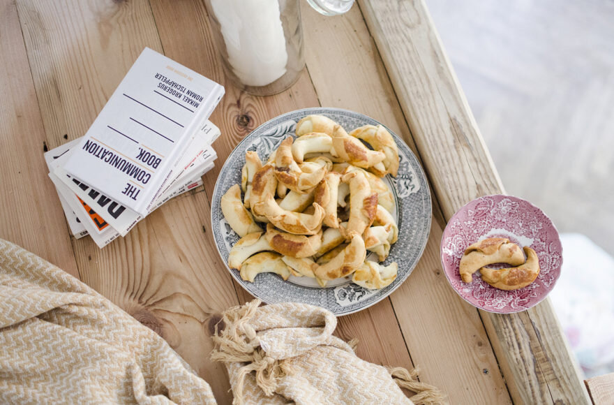 Сегодня эти круассаны - моя медитация. Мои мысли собираются, мой утренний кофе и минута молчания. Я сделала их в 6:00, смотря последний сезон «Доктора». Я думала, что дрожжевые круассаны, сделанные этим утром, в одиночестве, очень зимним утром в феврале - хорошая идея. Потому что зимние ностальгические утра - хорошее время, чтобы почувствовать запах дрожжевого теста. Время от времени пахнет родительским домом. Я запомнила рецепт этого дрожжевого теста на ближайшие 20 лет. Я не знаю, где я его взяла, но знаю наизусть, и к этому рецепту я обращаюсь очень часто. Потому что оно всегда подходит, как если я хочу сделать что-нибудь сладкое прямо сейчас, так и когда мне интересно, что приготовить к сочельнику. Это отлично подходит для десерта! Рецепт дрожжевых круассанов с яблоками и грецкими орехами Торт для дрожжевых круассанов: Вылейте сливки в миску, смешайте с дрожжами и яйцом. Добавьте растопленное, охлажденное масло и щепотку соли. Размешайте. Добавьте муку и замешайте тесто. Оно долж