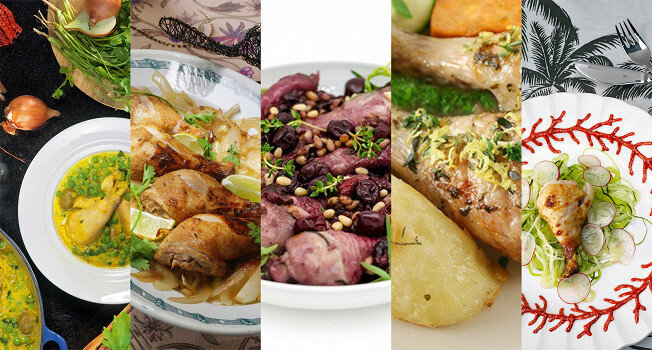 В ДУХОВКЕ И МУЛЬТИВАРКЕ — С ВИШНЕЙ, ЙОГУРТОМ, ШАФРАНОМ И ОЛИВКАМИ Голень — лучшее, что есть в курице. Во-первых, мясо голени чуть жирнее, чем мясо грудки, а потому и гораздо интересней. Во-вторых, компактность и смешно торчащая косточка, за которую голень удобно хватать. В-третьих, голень — порционное блюдо, и ее в отличие от целой курицы удобно готовить и подавать на больших семейных обедах: уж точно никто не подерется из-за лучшего куска. Мы выбрали шесть интересных рецептов, в которых куриную голень сопровождают очень разные продукты. Она легко вступает в союз со всем подряд — от редиски, чеснока и шафрана до йогурта, горошка и вишни — и во всех этих отношениях выглядит весьма достойно. Курица с зеленой лапшой и редисом Самое примечательное в этом рецепте — то, каким образом готовится курица. Ее сначала нужно отварить в остывающем бульоне (да, и так можно делать — просто оставить птицу в горячем бульоне на плите, предварительно выключив огонь), а затем чуть потомить в духовк