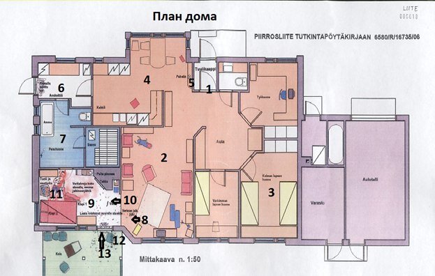 Среди ночи мы проснулись от звона стекла. Одновременно поднялись с кровати. На террасе перед входной дверью стоял человек. Через разбитое окно двери он попробовал дотянуться до ручки, а когда это не получилось, запрыгнул через это окно внутрь и напал на Юкки. Между ними завязалась настоящая драка. Каким-то образом, в один из моментов, я оказалась между ними. Именно тогда преступник ударил меня ножом. Было очень больно. Рана сразу же начала сильно кровоточить. Тогда я выскочила из спальни в гостевую комнату. Я открыла двери детской спальни и входные двери, приказав детям покинуть дом, но они меня не услышали или не послушались (Семилетний сын Александр показал на первом допросе, что лежал в своей кровати, зажимая уши, чтобы не слышать страшных криков отца).