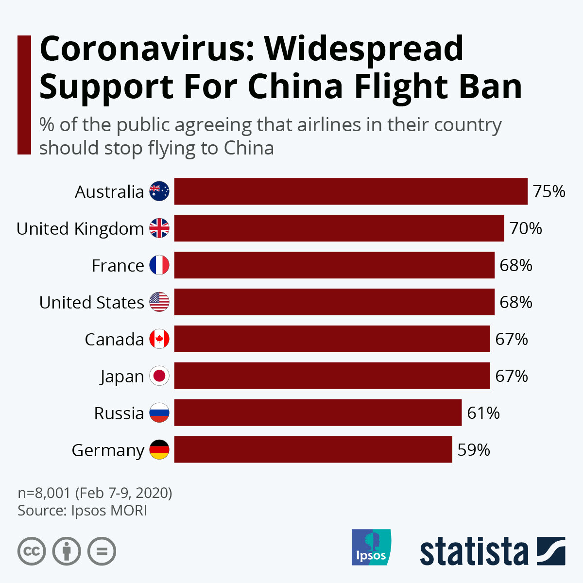 На первом месте - Австралия, три четверти населения не хотят, чтобы между их страной и Китаем было какое-то авиасообщение. В принципе, Австралия от Китая недалеко, так что их можно понять. Россия, правда, ещё ближе, но у нас за запрет полётов "только" 61% населения.