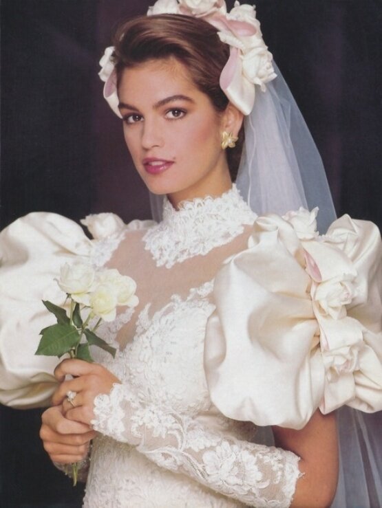 Сегодня хочется вспомнить о моде 90-х, о мировых свадебных тенденциях. Множество известных моделей рекламировали свадебную одежду. Мне больше всего запомнились показы Синди Кроуфорд и Клаудии Шиффер. Превосходные платья с рукавами-буфами, глубокое декольте, прикрытое тюлевой тканью. Лифы и рукава отделаны кружевом. Дополняют образ высокая прическа, пышная фата, диадема, украшения. Платья сшиты из кружева ручной работы. В области бедер пышные складки по типу турнюра, длинный шлейф. Это не Синди Кроуфорд, но похожая на нее модель. Платье богато украшено ручной вышивкой и кристаллами Сваровски. На плечах оригинальные детали в виде больших объемных бантов. Фата пышная многослойная с венком из белых роз. Наряды Клаудии Шифер более причудливы и фантазийны. Например, так выглядело свадебное платье от Шанель в 1994 году. Совершенно невероятный головной убор с перьями! И такое откровенное декольте, хоть и задрапированное сеткой. Словом, не каждая невеста отважилась бы надеть подобный наряд