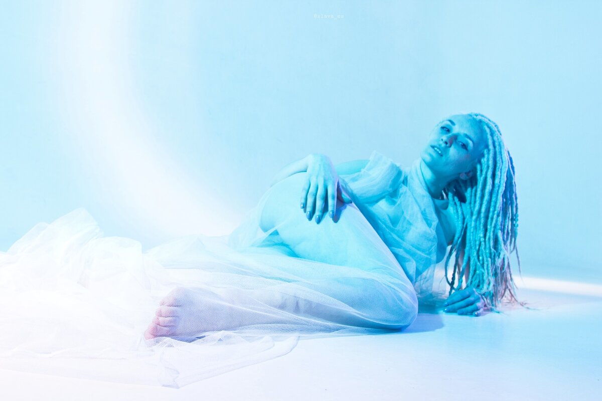 Изначально была концепция снять фотосессию в стилистике художественного фильма Джеймса Кэмерона "Аватар". Без хвостов и прочей дичи, а скорее передать красоту и эстетику того мира. Раз это Аватар, то соответственно фотосессия должна быть в синих оттенках. Для этого были использованы простые гелевые синие фильтры, которые прикрепили к двум рефлекторам. Тюль классно отражает, пропускает и поглащает свет одновременно, создавая красивый необычный эффект полувоздушной-полуводной субстанции Аватар был скорее как чем-то вдохновившим и создавшим настроение к данной съемке. Скорее отвлеченный космический мудборд, нежели прямой референс. Рефлекторы были размещены с двух сторон от модели под разными углами. За счет этого получилось создать переливы цвета, которые вы видите на заднем фоне. Это не фотошоп, это было сделано светом. Снималась фотосессия в студии с большой белой циклорамой. В качестве света были использованы всего 2 источника, оба рефлекторы с цветными фильтрами. Съемка производила
