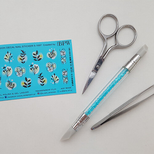 Дизайн вырезаем по контуру и опускаем в воду или кладем на смоченный в воде ватный диск.