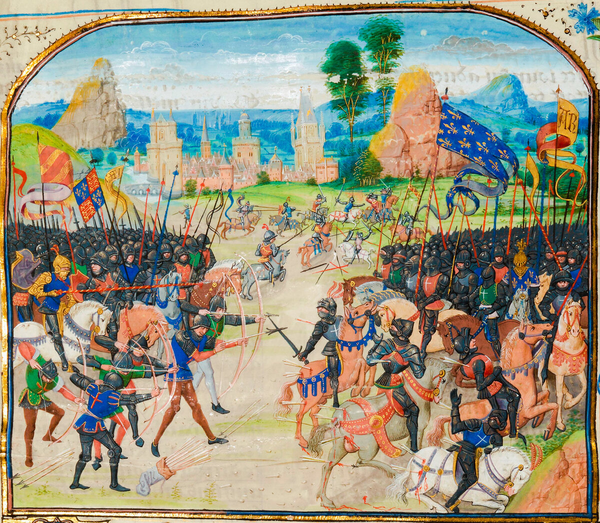 Реально же противостоять английской стреле мог именно спешенный рыцарь. Всем были хороши длинные луки, но пробивали рыцарские доспехи отнюдь не так часто, как хотелось бы. Рыцарь без лошади – небольшая неудобная мишень, прикрытая бронёй, дающей, скажем так, 90-процентную гарантию неуязвимости. Кроме всего прочего, позиции англичан были прикрыты виноградником, живыми изгородями, плюс палисадом из врытых в землю кольев. Не лучший полигон для рыцарской кавалерии.