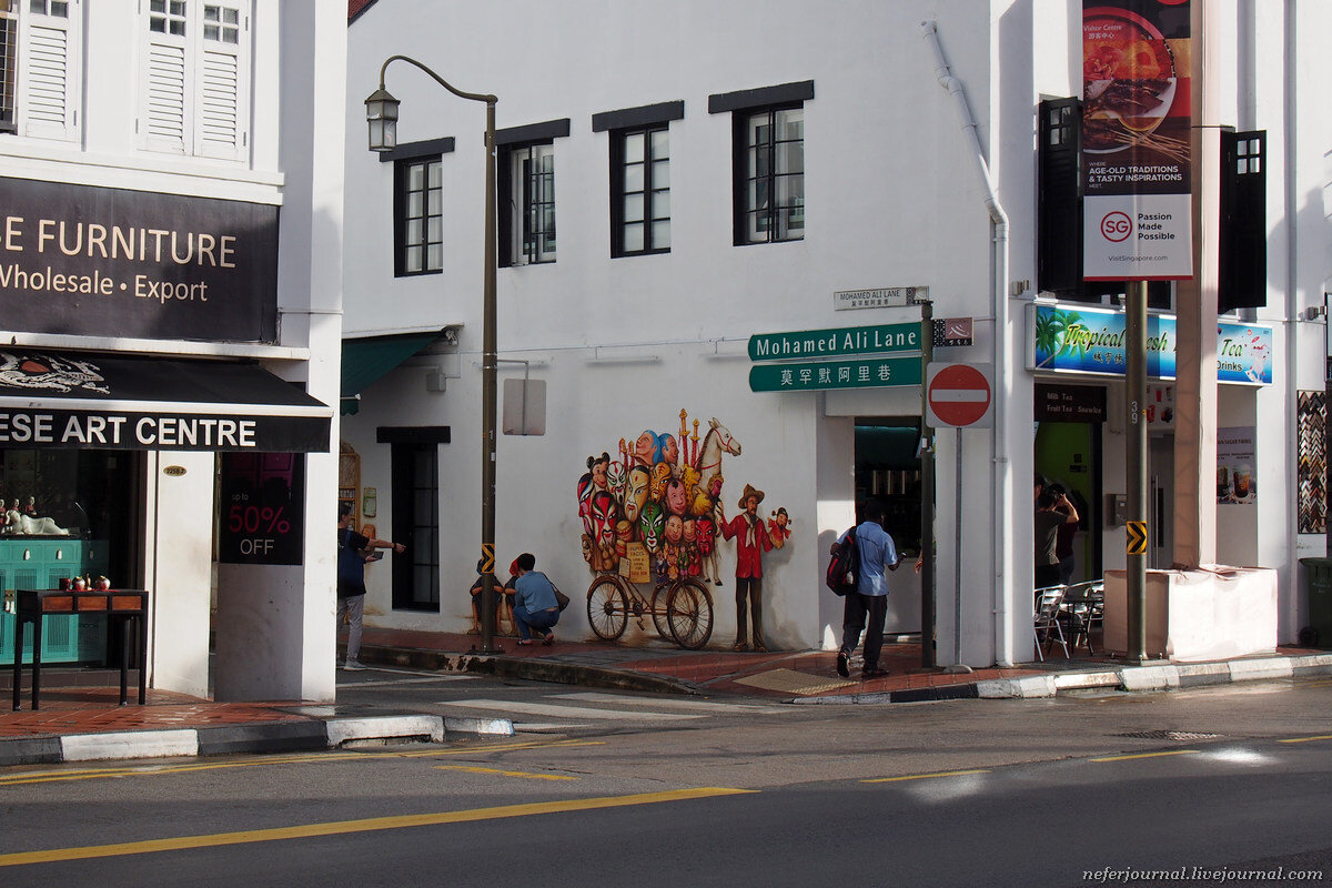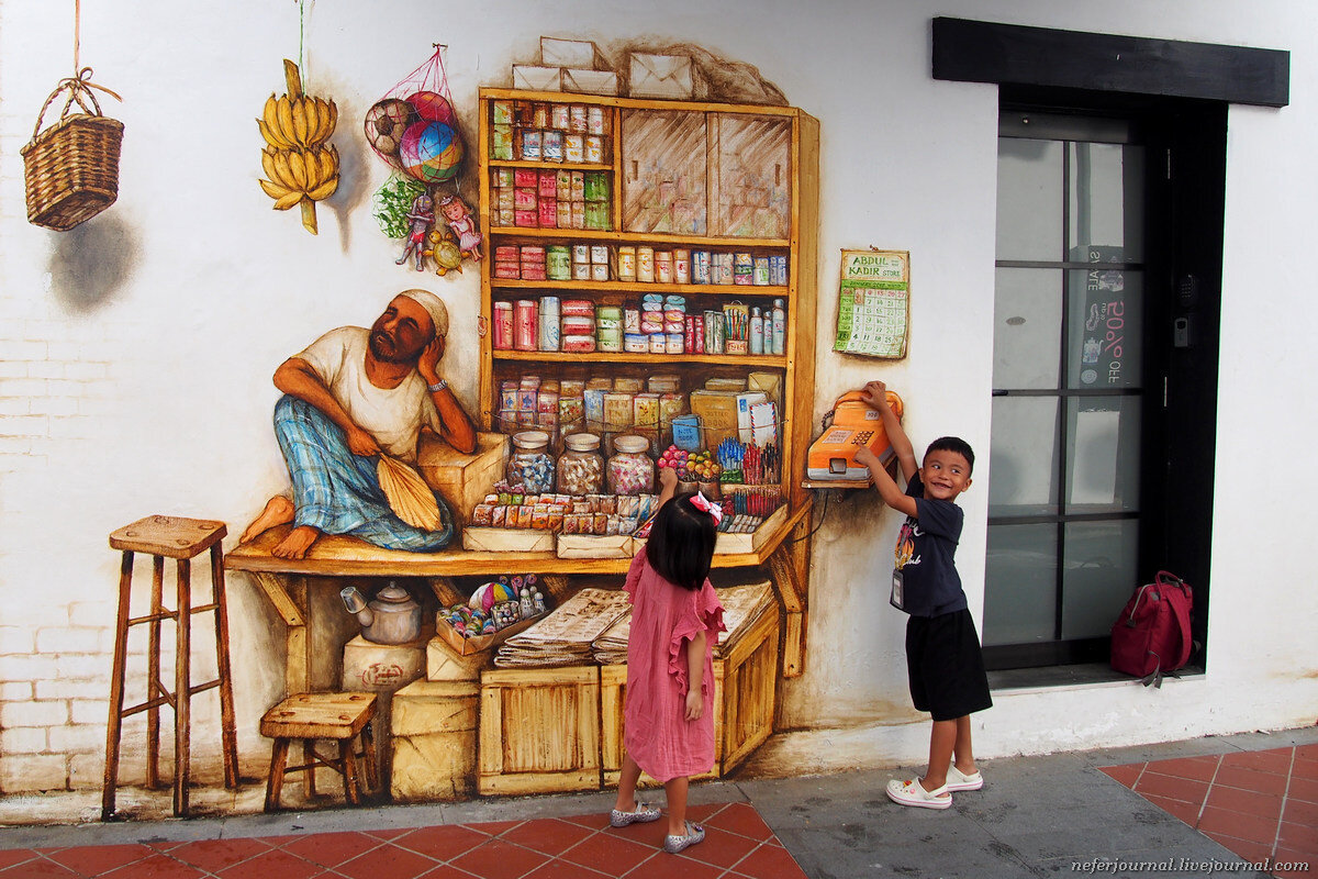 В этнических кварталах Сингапура много интересного стрит-арта. Изображены эпизоды из прежней жизни китайцев. Вот скучающий торговец, дальше женщины вешают постиранное белье и продавец бумажных масок. Если включить воображение, можно встроиться в картинку.