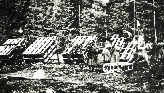 12 человек на 12 пусковых станков. Стрельба по площадям. Установка обычно ночью. На грузовиках подошли, все на себе перетаскиваем. Потом если время позволяло ячейки рыли, после открытия огня мы не отходили, а артналет обязательно немцы производили. Рама от немецкого огня не страдает. Пехота вперед уходит, нам становится легче.