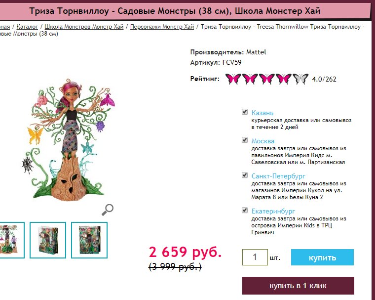 Когда я сажусь выбирать куклу в интернет-магазине, меня охватывает такой азарт - хочется найти самый выгодный вариант. Сегодня расскажу об очередном квесте)) Если речь идет о какой-то новинке, к бабке не ходи - дешевле будет на Амазоне. Но с монстрами совсем другая история.. Как вы знаете, производство Монстер Хай давно кануло в лету. Но во многих магазинах остатки еще лежат. Начнем интернет -серфинг: 1. Заглянем в наш российский магазин "Империя Кукол" . Мм.. на момент написания статьи 2659 руб. Не плохо, не плохо.. НО! Доставка в мой город обойдется мне в 350 рублей. Итого стоимость куклы 3009.. Уже не так радостно)) Идем дальше.. 2. Ладно, посмотрим на Амазоне. Кукла $37.95 + доставка $38.76. Итого около 5000! Совсем не весло.. 3. И даже Авито ничем не порадовал 4. Ну все, не буду вас томить. Свою Тризу я купила на Ebay в магазинчике Krocoworld с доставкой она обошлась мне около 2300 рублей! Пришла очень быстро, меньше 2-х недель! Даю ссылку на все куколки Monster High у этого пр