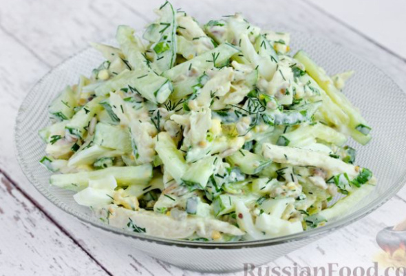 Куриный салат с огурцом. Очень простой и лёгкий салат! Ингредиенты: Приготовление: 1.Отвариваем куриную грудку. 2.Снимаем шкурку с огурца и нарезаем его. 3.Нарезаем лист салата (можно нарвать руками). 4.Нарезаем куриную грудку. 5.Кладем все в тарелку. 6.Добавляем сметану, чеснок и горчицу. Готово! Приятного аппетита!