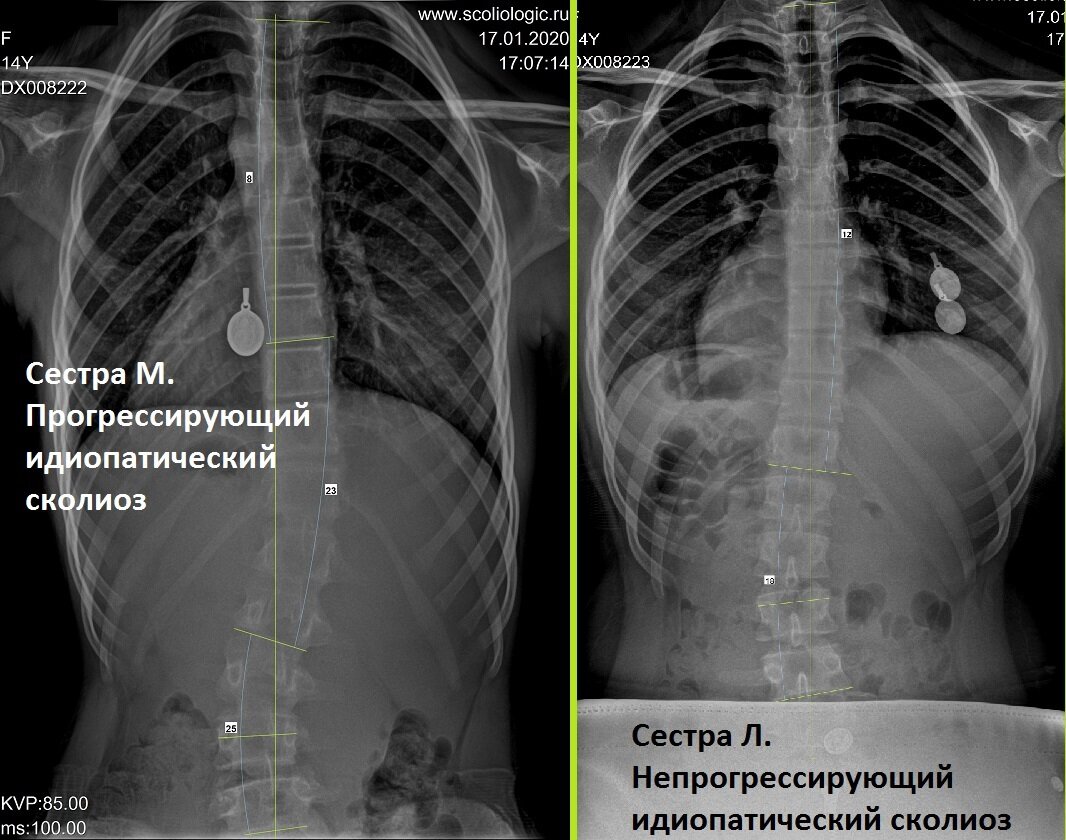 Справа - сестра Л. Градусы 12-18. При таких градусах корсет не надеваем, наблюдаем. Но и через полгода градусы такие же. Девочка с сестрой занимается специализированной гимнастикой. Но прогрессии нет и не будет, если ее нет сейчас.