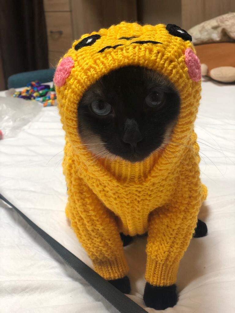 Вязаный комбинезон в стиле мультгероя Пикачу по пути к своему владельцу мальтизу задержался для фотосессии.