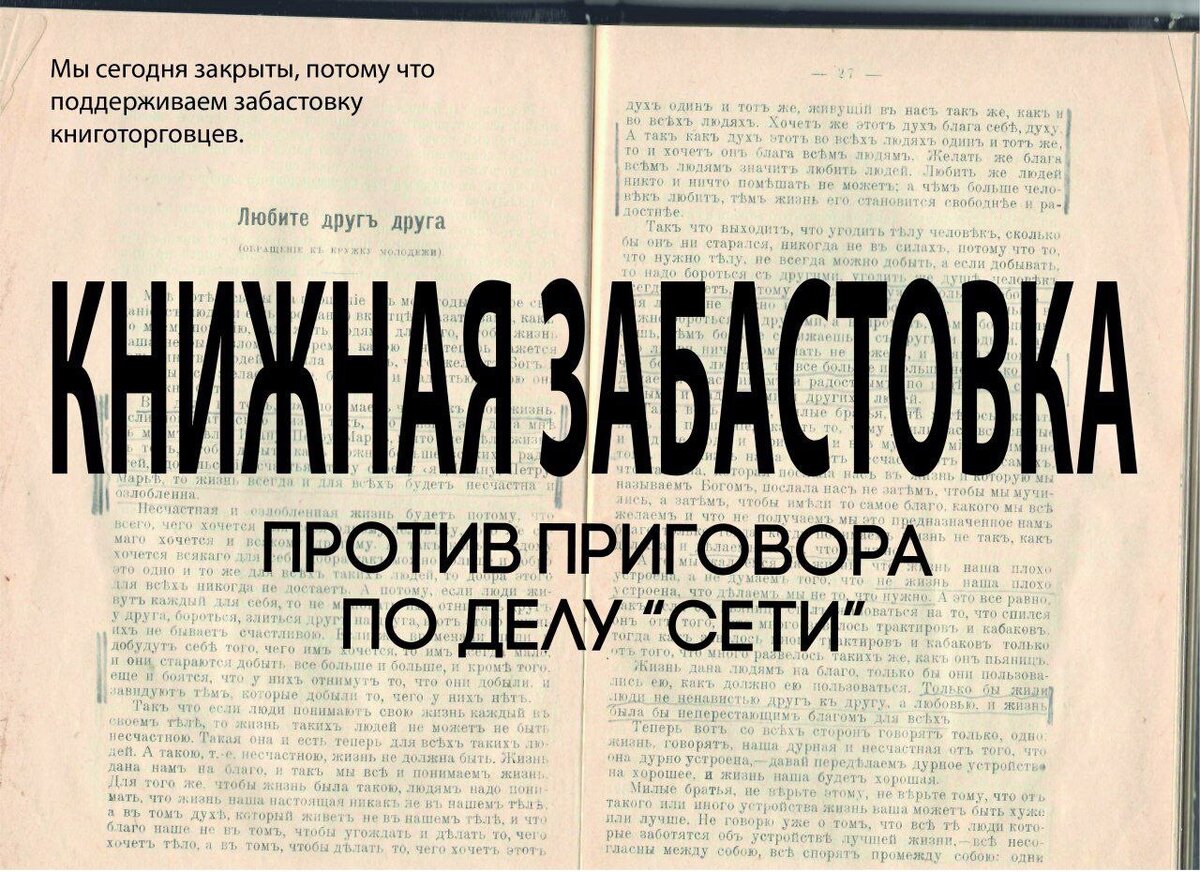 В России пройдёт «Книжная забастовка» в защиту фигурантов «дела Сети» Пока девять независимых российских книжных магазинов объявили о том, что не будут работать 17 февраля, а их сотрудники выйдут на одиночные пикеты в поддержку осужденных. До этого российские учителя и учёные выступили в поддержку фигурантов дела «Сети» написав открытые письма.