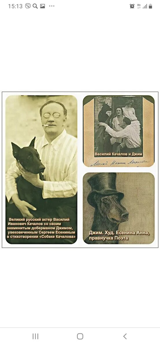 Наверное все с детства знают строки Есенина " Дай, Джим, на счастье лапу мне..." Джимом звали собаку актера Василия Качалова. Артист московского Художественного театра В. И. Качалов, вспоминая первую встречу с Есениным, состоявшуюся весной 1925 года, пишет: « Часам к двенадцати ночи я отыграл спектакль, прихожу домой... Небольшая компания моих друзей и Есенин сидят у меня... Поднимаюсь по лестнице и слышу радостный лай Джима, той самой собаки, которой Есенин потом посвятил стихи. Тогда Джиму было всего четыре месяца. Я вошел, увидел Есенина и Джима - они уже познакомились и сидели на диване, вплотную прижавшись друг к другу. Есенин одною рукой обнял Джима за шею, а другой держал его лапу и хриплым баском приговаривал: "Что за лапа, я сроду не видал такой". Джим радостно взвизгивал, стремительно высовывал голову из подмышки Есенина и лизал его лицо; когда Есенин читал стихи, Джим внимательно смотрел ему в рот. Перед уходом Есенин долго жал ему лапу: «Ах ты, черт, трудно с тобой рас
