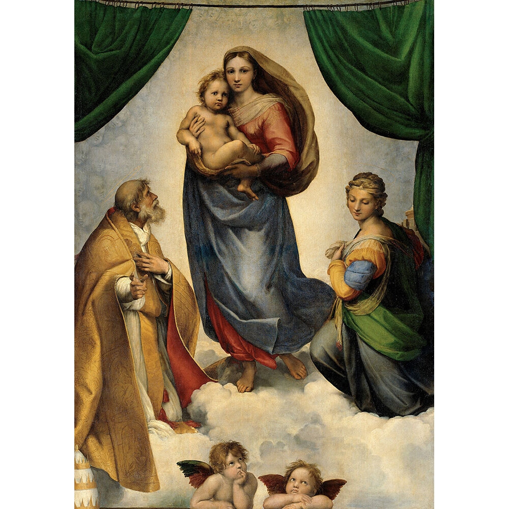 Его слова и идеи подталкивают человека помогать, верить и сострадать ближнему своему. Он помогал людям поверить в себя и призывал верить всех в великое предназначение человека. Все эти идеи гуманизма Рафаэль творчески показал на своём полотне. Начинается картина с бесконечного чистого и голубого неба. На небесах еле видно лики бесплотных созданий. Все их взгляды направлены на героиню картины. Взгляд Небесной Царицы устремлен далеко вперед, и для её взора доступно то, что не видят просты