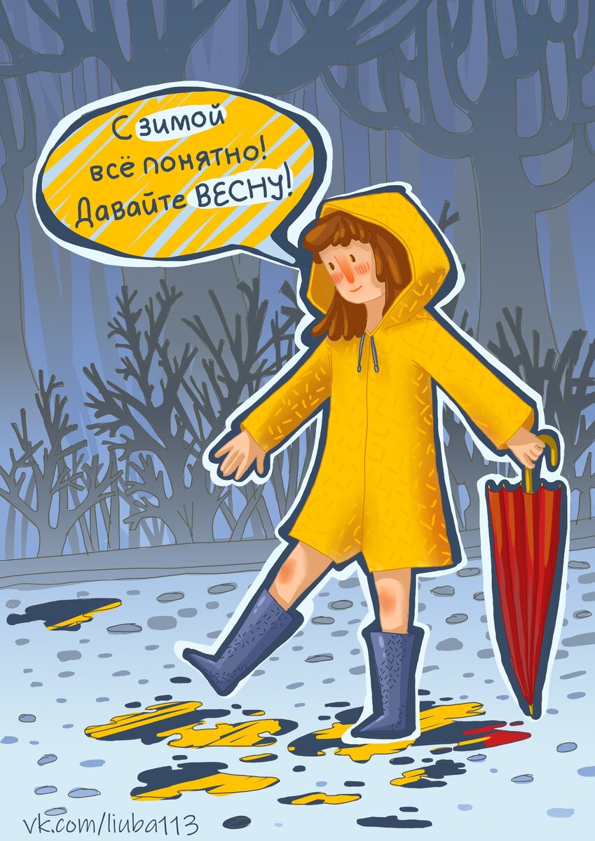 В последнее время стараюсь "зарисовывать" свои мысли в течение недели. Вот зима в этом году меня расстроила, но как только я нарисовала эту картинку, сразу пошёл снег и пришлось рисовать ещё одну. Снег, конечно же, моментально растаял, и поскольку на улице дождь, слякоть, то я простудилась, и в порыве жалости к себе, и нежности ко всему теплому и пушистому, вытирала сопли об животик кошки. Кошка была не рада.