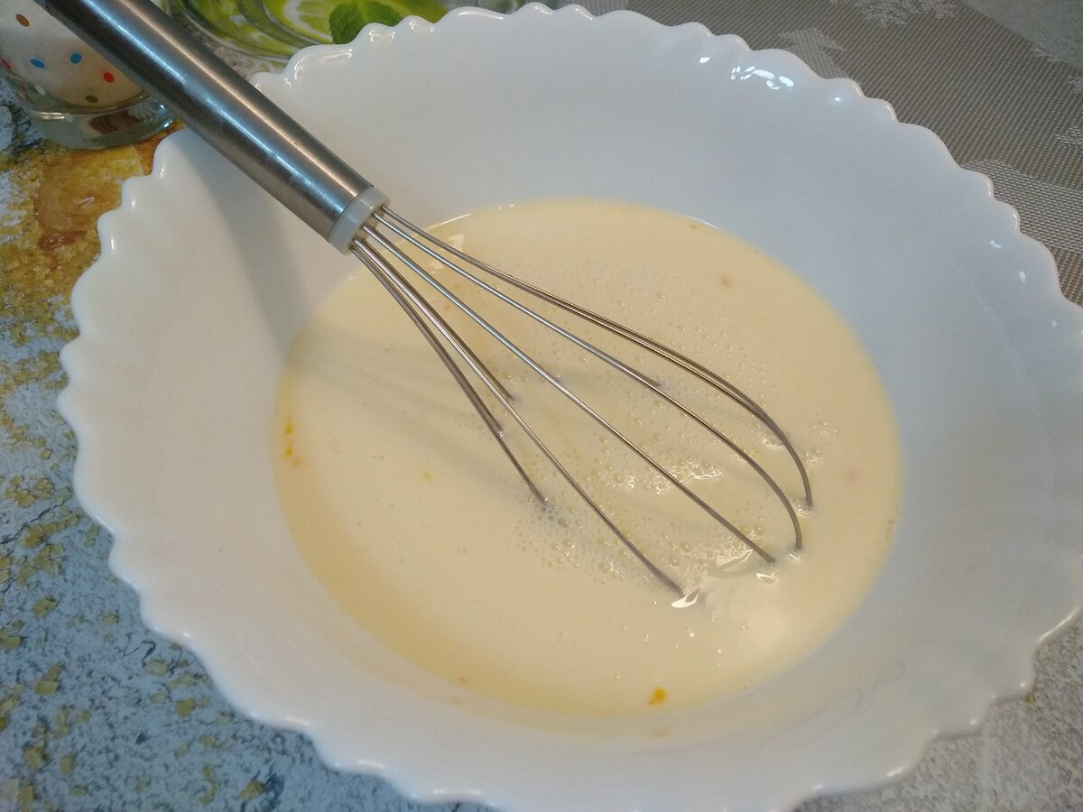 Готовим тесто для блинчиков. В глубокую миску разбить 3 яйца, добавить соль, сахар и молоко, хорошо перемешать.