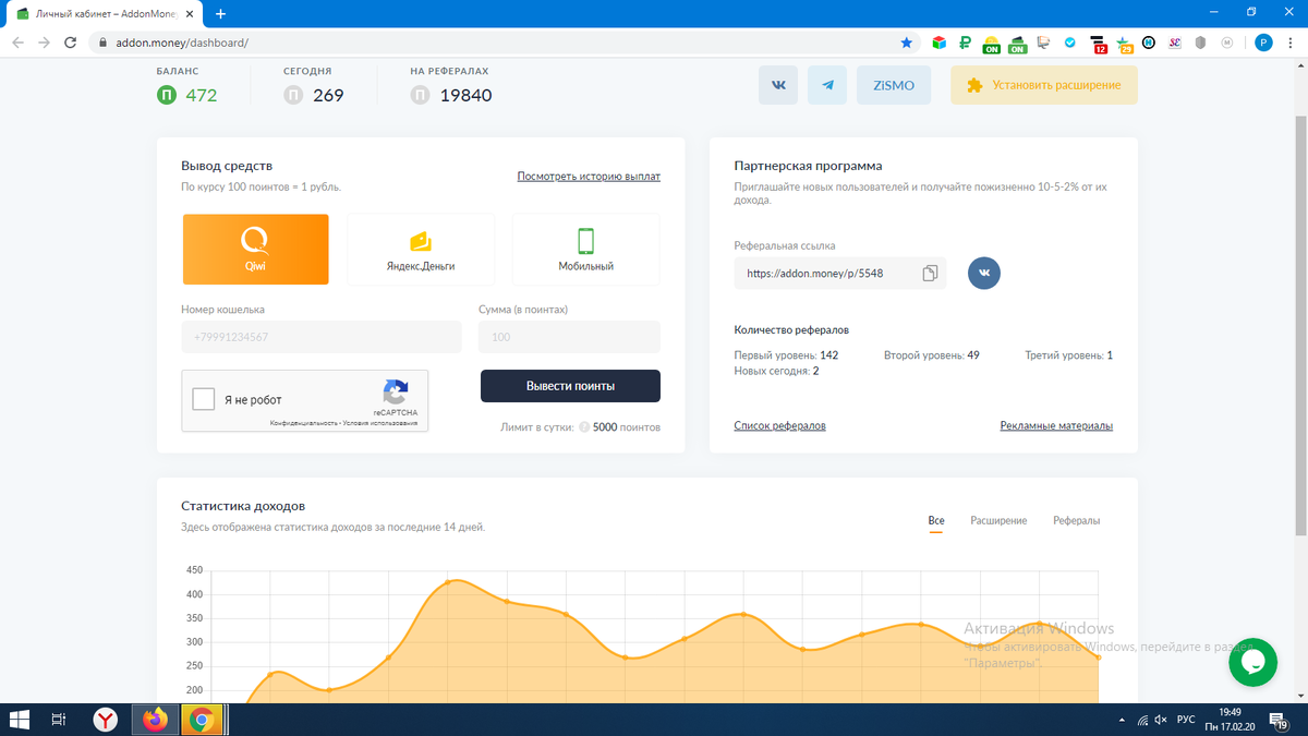 Расширение AddonMoney при посещении различных веб сайтов, то есть пока подключен интернет, автоматически зарабатывает для вас деньги, поэтому зарабатывать можно прямо во время серфинга по любимым ресурсам. Каких-либо других действий от пользователя не требуется – достаточно лишь установить расширение и начать получать пассивный доход. Вы можете заниматься чем угодно, от домашних дел, до офисной работы, поинты капают автоматом.