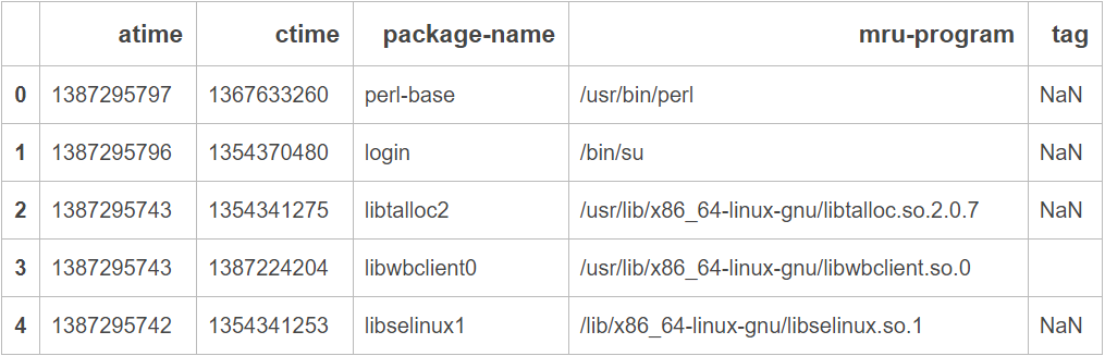 popcon.columns = ['atime', 'ctime', 'package-name', 'mru-program', 'tag'] In [3]: popcon[:5] Out[3]: Магия в обработке timestamp в pandas в том, что numpy datetime сохраняются, как Unix timestamp. Поэтому всё, что нам нужно - это сказать pandas, что эти целые числа -