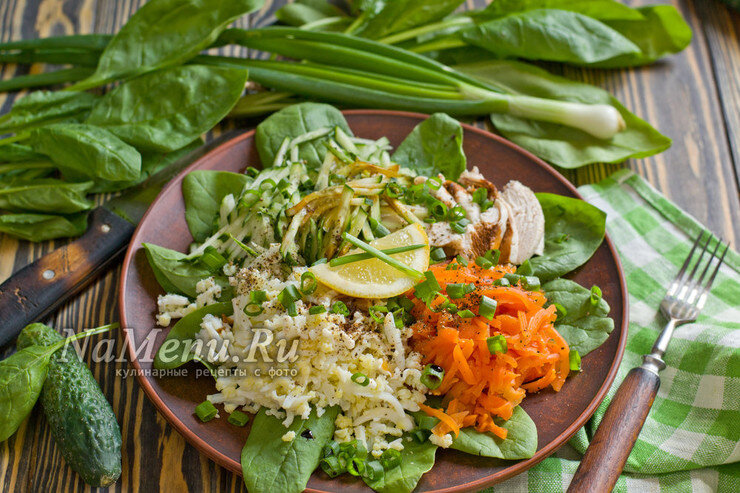 Ингредиенты: 🍃Листочки шпината промываем и. Выкладываем на тарелку веером 🥕Сваренную в мундире морковь чистим, натираем на крупной тёрке. Кладём на тарелку горку тёртой морковки 🐓Отварную куриную грудку нарезаем ломтиками и выкладываем рядом с горкой моркови. Мясо должно быть холодным и без кожи 🥒Шинкуем тонкой соломкой свежий огурец, кладём рядом с мясом горку нарезанного огурца 🥚Сваренное вкрутую яйцо натираем на крупной тёрке. Размещаем между морковкой и огурцом 🌱Посыпаем блюдо мелко порубленным зелёным луком 🍋Поливаем соевым соусом, посыпаем черным перцем и выжимаем сок из половинки лимона или лайма https://namenu.ru/10916/Dieticheskij_salat_s_kurinoj_grudkoj/