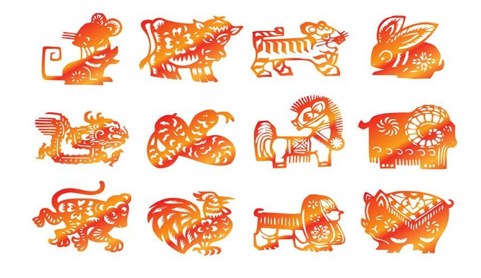 鼠shǔ крыса、牛niú бык、虎hǔ тигр、兔tù заяц、龙lóng дракон、蛇shé змея、马mǎ лошадь、羊yáng баран、猴hóu обезьяна、鸡jī петух、狗gǒu собака、猪zhū свинья
