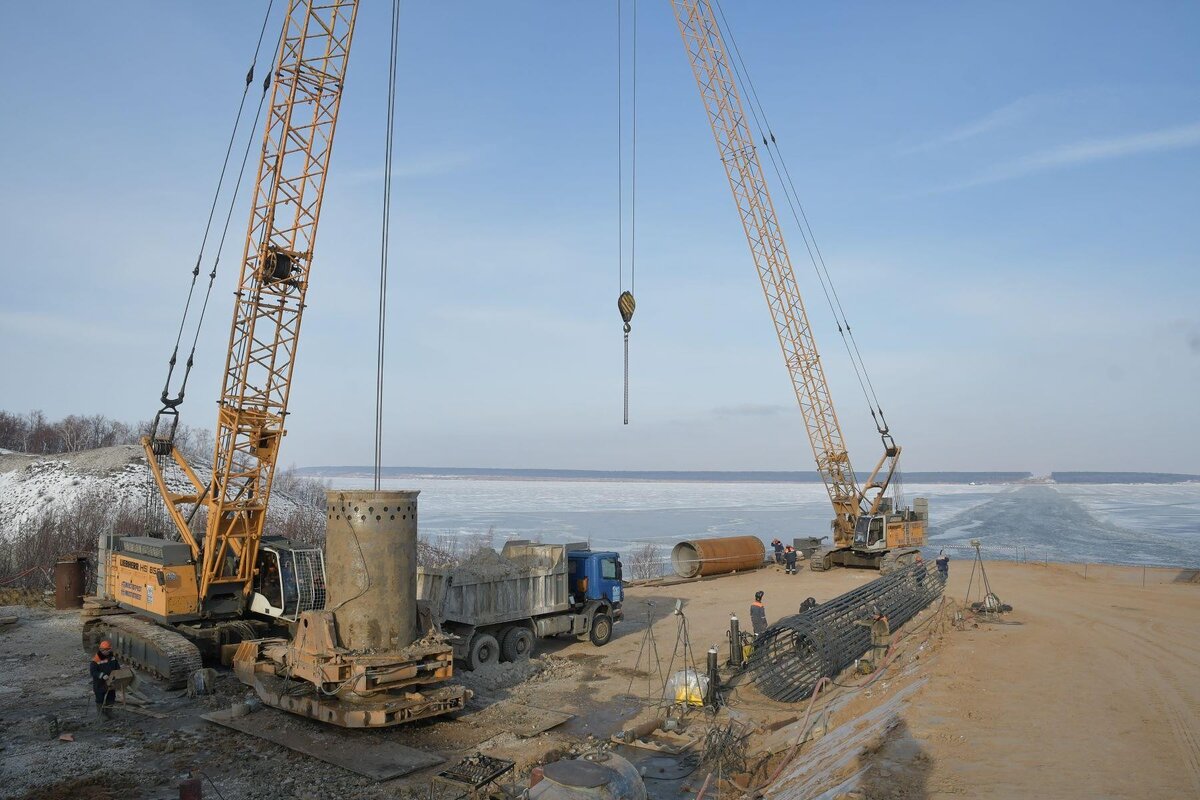 Сейчас в районе будущего моста возводят производственные площадки и временные дороги.
