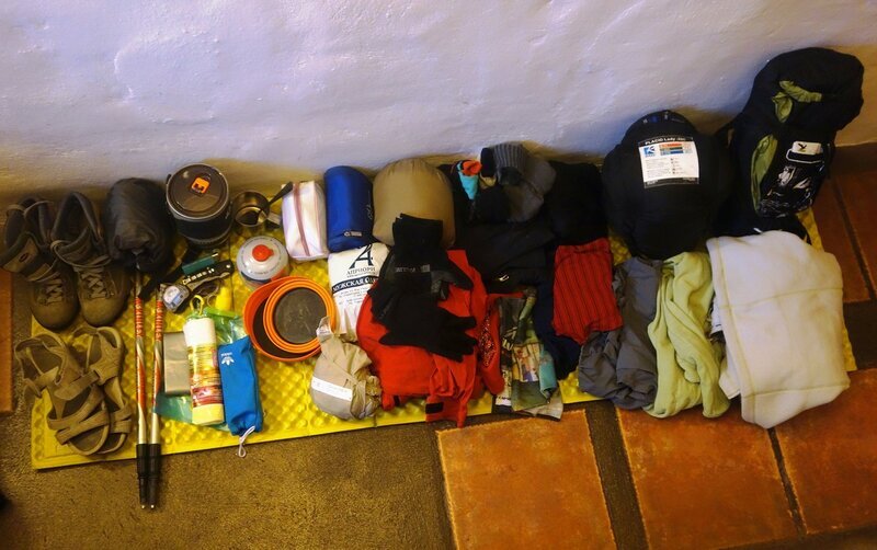И да, здесь я сфотографировала все вещи, которые взяла с собой за исключением треккинговых брюк (которые мне лень с себя снимать было :) ), поэтому несложно догадаться, что во время похода часть вещей окажется на мне, а не в рюкзаке.