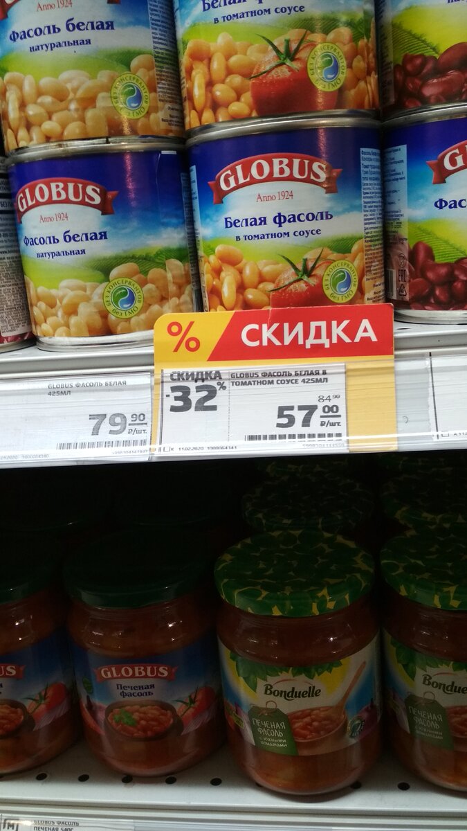 Доброго времени суток! Сегодня, дорогие охотники за скидками я покажу вам товары по хорошим ценам в магазине Магнит. 17 февраля я побывал в этом супермаркете и вот что обнаружил: Фасоль белая Globus в томатном соусе 425мл. Фасоль известной фирмы по скидке 32%. Старая цена была 84.90 руб. Цена по скидке - 57 рублей. Конфеты КОРКУНОВ ассорти 192 гр. Набор шоколадных конфет КОРКУНОВ. Хороши конечно в подарок и дамам, но до 8 марта ещё далековато, но всё же скидка в 53% неплоха. Старая цена была 429 руб. Цена по скидке - 199 рублей. Конфеты Родные Просторы 200гр. Всем известный набор конфет по ещё больше привлекательной цене. Мне эти конфеты очень нравятся. Старая цена была 269.90 руб. Цена по скидке - 99.90 рублей. Скидка целых 62%. Чай Greenfield English Edition 100 пакетиков Со скидкой 43% продаётся пакетированный черный чай Greenfield. Скажу, что цена со скидкой очень даже хороша. Старая цена была 349.90 руб. Цена по скидке - 199 рублей. Чай Nestea лесные ягоды 1,5л