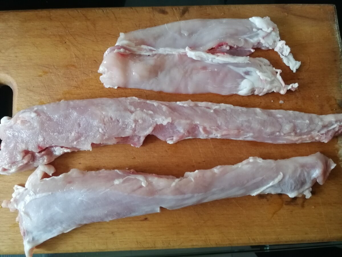 На выходных мы с мужем сходили прогуляться на рынок и купили там молоденького домашнего кролика. Я разделала его на части - лапки отдельно, ребра и спинку отдельно, а вот с самым лакомым местечком - толстым и тонким краем, а также вырезкой возилась сегодня. Вот они, эти драгоценные кусочки: Это место нежное, быстро готовится. Из него я и решила приготовить сегодня котлеты. Ингредиенты: Приступаем 1. Для начала подготовим батон. Мой был нарезанным, поэтому с каждого отдельно кусочка я сняла корочку. Мякиш разделила на 3 части. 2 из них заморозила, чтобы сделать крошку, а одну - замочила в сливках. 2. Вторым шагом подготавливаем лук. Для этого чистим его, мелко-премелко режем и кладём на ХОЛОДНУЮ сковороду с кусочком масла, включаем самый тихий огонь и даём луку растушиться. Очень важно следить, чтобы он не стал жариться, а дошел до примерно вот такого состояния: 3. Приступаем к разделке мяса. Режем кролика ножом на очень тонкие, но удлиненные кусочки. Потом смешиваем мясо, лук и раз