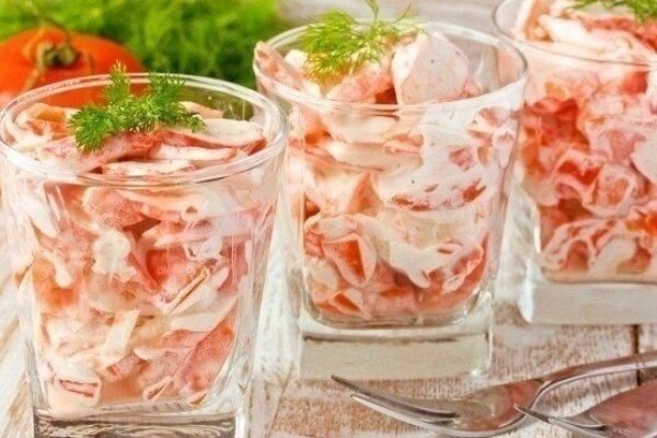 Ингредиенты: -Крабовые палочки — 240 г -Помидоры — 2 шт. -Чеснок — 2 зубчика -Соль, перец — по вкусу -Майонез — 3–5 ст. л. -Можно добавить варёные яйца Приготовление: 1. Для приготовления салата нам понадобятся незамороженные крабовые палочки, помидоры с плотной мякотью, соль, чёрный молотый перец, чеснок и жирный майонез. Я брала замороженные палочки и легкий майонез, тоже вкусно! 2. Крабовые палочки нарезаем не слишком тонкими кольцами наискосок, чтобы кольца получились широкими. 3. Помидоры моем, вырезаем плодоножки и нарезаем небольшими кубиками. Образовавшийся сок с помидоров сливаем. 4. Чеснок чистим и измельчаем. 5. Соединяем подготовленные ингредиенты: крабовые палочки, помидоры и чеснок. 6. Заправляем их майонезом, немного солим и перчим. 7. Перемешиваем салат. 8. Раскладываем салат в порционные креманки или бокалы, по желанию украшаем свежим укропом и подаём к столу!