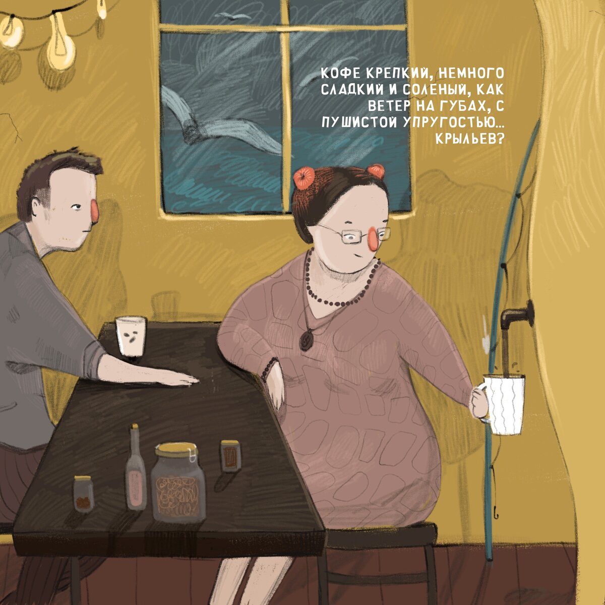 Санти поднимается на маяк. Со скрежетом прогибает механические колени, прихрамывая подходит к Кошь. Та сидит в раскрытом окне, болтает босыми ногами и прихлебывает кофе из большой чашки. “Ну, просил же: окна не открывать, когда я кочегарю” - ворчит он,“Вылезай давай. Закупорю обратно”. “Подумаешь!”, фыркает Кошь, выползает из окна, встает на ноги, говорит нараспев, - “Кажется, дождь собирается”. “Да уж, конечно, собирается! Такой конденсат”. И правда, над побережьем сгущаются тучи, падают первые тяжелые капли кофейного дождя, стучатся в маяк. Кошь пальчиком стучит им в ответ по стеклу, потом немного дышит на него, чтобы запотело, и рисует чайку. И еще, подумав, выводит: “Не можешь плыть - лети”.
