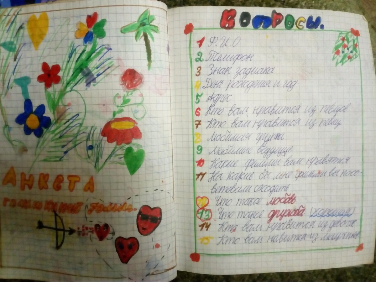 Недавно разбирала старые книги и неожиданно среди них нашла свою школьную анкету. Меня накрыла волна воспоминаний. С волнением листала исписанные разными почерками странички, рассматривала рисунки. Не могла оторваться от анкеты, пока не прочитала всю. Затем пришли дети из школы и принялись с большим интересом и удивлением ее изучать. В конце 80-х - начале 90-х такие анкеты, наверное, вели все девочки и даже некоторые мальчики. Для ведения анкеты выбиралась качественная толстая общая тетрадь. Хозяйки анкет тщательно трудились над их дизайном, продумывали, какими будут обложка, титульный лист, а также подготовленные для опрашиваемых сюрпризы. Вопросы делились на несколько блоков. По классике жанра первая часть была самой информативный и официальной. Ребята называли свои ФИО, домашний адрес, школу, класс, номер домашнего телефона, дату рождения. Затем им предлагалось рассказать о своих предпочтениях в музыке, назвать любимые фильмы, телепередачи. Конечно, самыми главными были