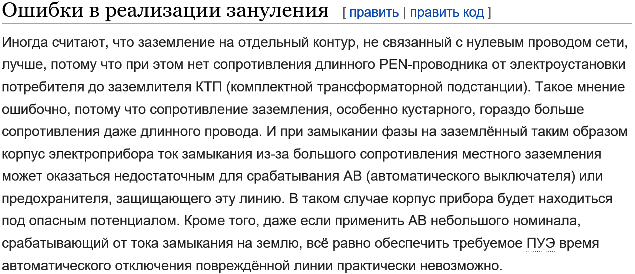 Заключение. Авторы статьи «Зануление», опубликованной в Википедии, не знают терминологию и требования действующей нормативной документации, распространяющейся на низковольтные электроустановки. Поэтому они не смогли корректно изложить информацию о занулении, которая представляет интерес лишь с точки зрения истории развития нормативных требований к низковольтным электроустановкам.