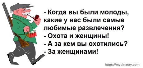 Охота жёны Встретились три охотника и хвалятся свои ми собаками. Первый: — Пошел я один раз на охоту — ружье взял, а патроны забыл. Дал собаке понюхать ружье — она патроны принесла! Второй: — Пошел я один раз на охоту — патроны взял, а ружье забыл. Дал собаке понюхать патроны — она ружье принесла!! Третий: — А я как-то пошел с женой купаться, а она купальник забыла. Дал собаке у жены промеж ног понюхать — она соседа за яйца притащила!!! Медведь Собрались молодые Охотники на охоту на медведя. Опытный егерь инструктирует их перед началом: - Хорошо. Единственное, когда увидите медведя, а ружьё не выстрелит, нужно отходить так: шаг вправо, шаг назад, шаг влево, шаг назад и т. д. Охотники в шоке: - А чего так? - Чтобы в дерьмо не вступить... Охота такая охота Жена звонит мужу на мобильник: - Ваня, ты где? - На охоте. - А кто это так дышит громко? - Медведь. - А стонет почему? - Ранил я его. - А почему голос женский? - Ну, знаешь! Я охотник, а не ветеринар! Собаки Один охотник другому: - Зн