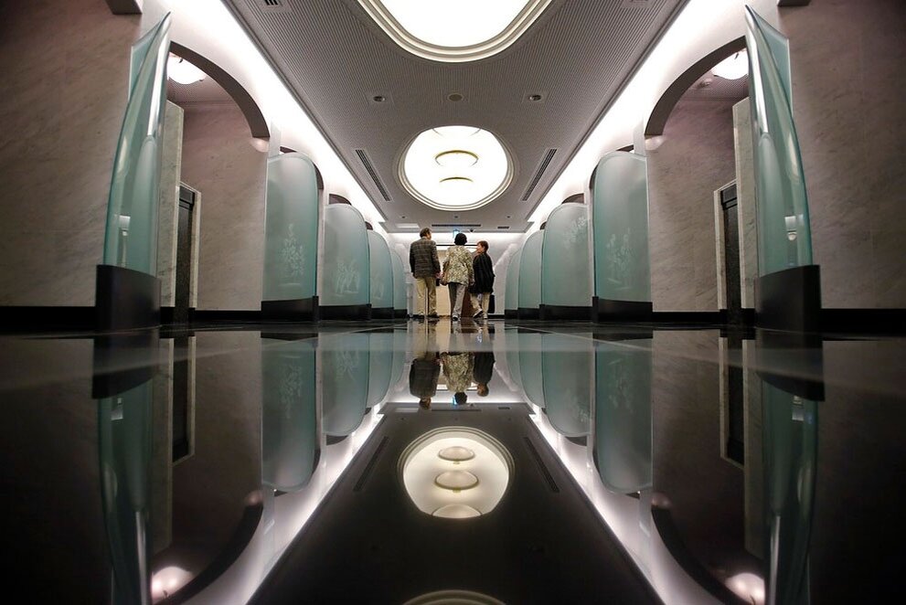 С населением, которое в течение ближайших 50 лет, сократится на почти 30 миллионов человек, похоронный бизнес очень актуален и востребован. В целях экономии пространства похороны, могилы и места на кладбищах стоят довольно дорого, поэтому люди предпочитают подготовить все заранее. Одним из таких современных высокотехнологичных кладбищ является «Руриден» — кладбище в центре Токио, которое использует светодиодные фонари высокой мощности для освещения более 2000 статуй Будды. Юкико Кимура со своей сестрой Киёко Мацуура и мужа Киёко Йошихару после молитвы за покойного родственника в Риогоку Руоён — кладбище с многоэтажным хранилищем в центре Токио 27 октября 2014 года. Мужчины молятся перед современной могилой, из которой с помощью робота извлекается надгробие или урна, на основании которых обеспечивается удостоверение личности на кладбище Риогоку Руоён в центре города Токио 27 октября 2014 года. Сотрудник демонстрирует, как использовать пластиковую карточку доступа к могиле родственника н