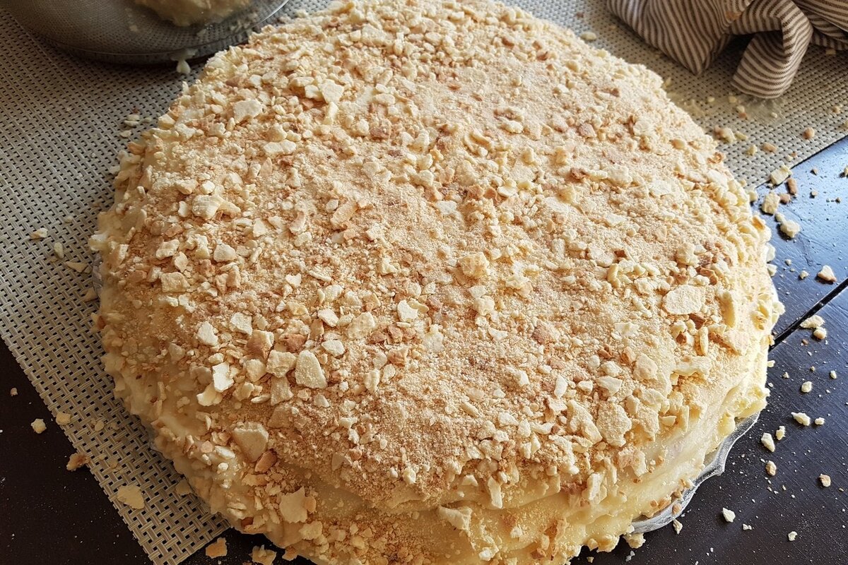 Ингредиенты для теста: ✓ 1,5 стакана молока ✓ 200 г сливочного масла ✓ 1 стакан сахара ✓ 2 яйца ✓ 1 столовая ложка растительного масла ✓ 0.5 чайной ложки соды, погасить в уксусе ✓ щепотка соли ✓ мука (около 2 кг) Для крема: ✓ 2 стакана молока ✓ 4 яйца ✓ 1,5 стакана сахара ✓ 600 г сливочного масла ✓ 1 банка сгущенки, не вареную ✓ пакетик ванилина Рецепт приготовления На поверхность стола просеять муку, добавить соль и сахар, перемешать. Затем добавить тертое на терке охлажденное сливочное масло. Перетереть тесто руками или вилкой в крошку. После этого в крошку добавить яйца, гашеную соду. Перемешать массу, влить растительное масло и холодное молоко. Замесить тесто средней консистенции, разделить на 20-22 части. Каждый кусочек теста раскатать в тонкую лепешку. Накрыть лепешку из теста крышкой или тарелкой и обрезать остатки. Лепешку наколоть вилкой, как на фото. Сковороду хорошо разогреть БЕЗ МАСЛА и выложить один из наших коржей. Жарить коржи из теста с 2 сторон под крышкой на умер