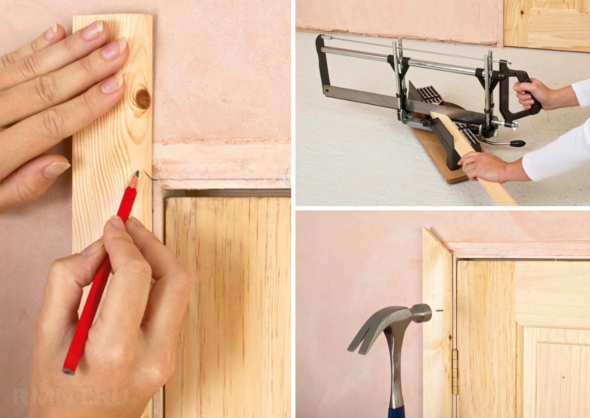 Наличники закрывают щели, зазоры, следы монтажа. Их подбирают по фактуре, ширине и цвету. С эстетической точки зрения важно, чтобы наличник гармонировал по цвету с дверным полотном. Практически невозможно изготовить дверь без зазоров. Значительно проще использовать наличники. Их ширина должна быть такой, чтобы полностью закрыть все дефекты. Перед началом работ выполняют определенную подготовку. Нужно проверить ровность и плоскостность стен, находящихся рядом с дверным проемом. При необходимости выполняется выравнивание. Важно в ходе работ следить, чтобы в процессе работ стены всегда находились в одной плоскости относительно друг друга, в противном случае между наличником и стеной образуются щели. Наличник отлично закроет неровности и трещины, размер которых не превышает трех миллиметров. Большие дефекты таким способом скрыть затруднительно. Очень важно точно выполнить подгонку деталей под заданным углом. Он должен составлять 46 или 90 градусов. Для распиливания заготовок используют