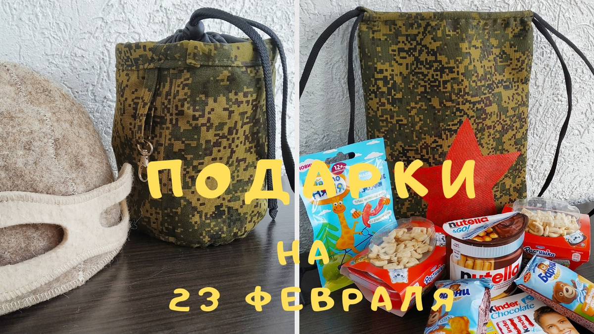 В преддверии праздника все задумываются что подарить на 23 февраля? А если подарок сделан своими руками, то это добавит уникальности. Я предлагаю сшить удобную сумочку для мужа, которую с помощью карабина можно крепить к шлёвке. А наполнение его приятно удивит!) А для сына сшить удобный рюкзачок, который наполним сладостями. Подробный процесс изготовления вы можете посмотреть в моем видео. Приятного просмотра!