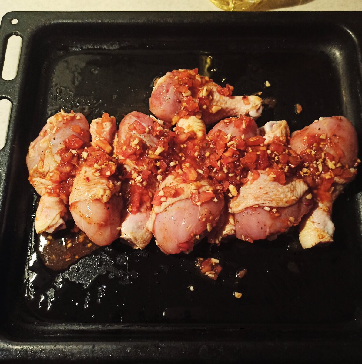 Ингредиенты: Куриная голень 1лоток Помидор 2шт Чеснок 5 зубчиков Приправа для окорочков можно просто для курицы Соевый соус Рецепт : Промываем голень и наливает в чашку соевый соус и оставляем . Тем временем кладём помидор в глубокую миску и заливаем кипятком на 15-30 сек . Достаем и чистим от кожуры потом мелко режем И также чеснок Чеснок с помидорой смешиваем И выкладываем в чашку с курицей сыпим приправы все это хорошо перемешиваем и оставляем на 15 мин мариноваться . Разогреваем духовку на 180 градусов Смазываем противень маслом выкладываем курицу на противень и ставим на 60 мин запекаться . Спасибо за внимание. Всем приятного аппетита 🔪🍽️