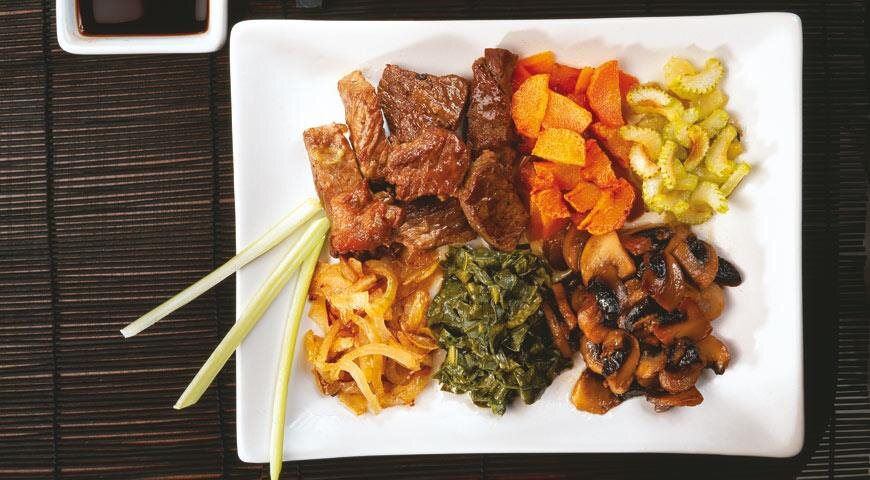 ИНГРЕДИЕНТЫ ПОШАГОВЫЙ РЕЦЕПТ ПРИГОТОВЛЕНИЯ Шаг 1Говядину порезать небольшими кусочками поперек волокон.Шаг 2Смешать воду, соевый соус и сахар. Перемешивать, пока сахар совершенно не растворится.Шаг 3Сельдерей и морковь нарезать кольцами. Зеленый лук крупно нарезать. Шампиньоны нарезать четвертинками. Шпинат крупно порубить.Шаг 4В большой сковороде с антипригарным покрытием на сильном огне разогреть масло, положить отдельно, не смешивая, сельдерей, морковь, грибы и зеленый лук. Полить овощи и грибы смесью соевого соуса, сахара и воды.Шаг 5Дать закипеть, готовить 5 мин. Отодвинуть овощи в сторону, добавить говядину. Вновь дать закипеть. Готовить еще 5 мин.Шаг 6Сдвинуть все готовящиеся продукты в сторону. Добавить шпинат и готовить еще 3 мин. Подавать, не смешивая ингредиенты между собой, выложив их аккуратно на тарелки. На гарнир можно предложить отварной рис или лапшу с несколькими побегами зеленого лука.