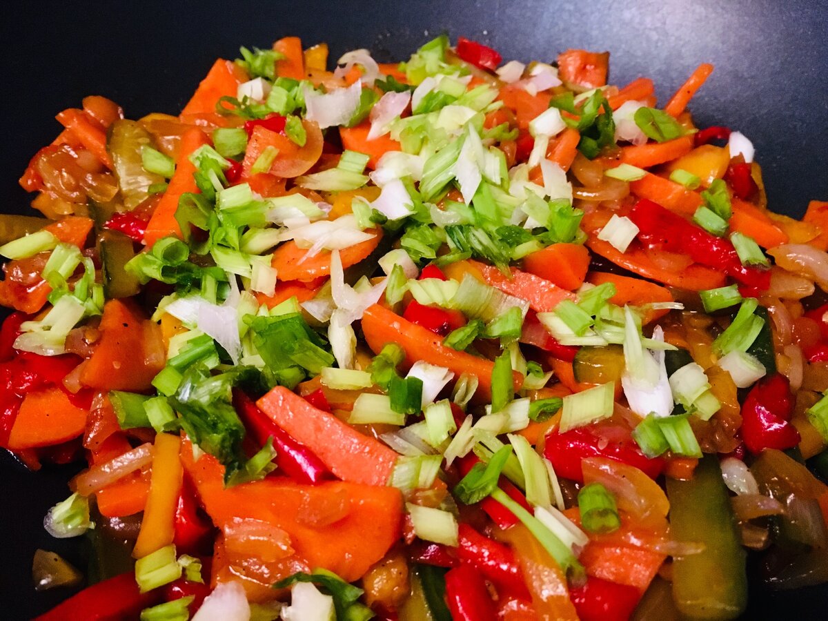 Любителям овощей посвящается.... Вам понадобится: Морковь...........1 шт. Перец болгарский.....1 шт. Лук репчатый..........1 шт. Огурец свежий.........1 шт. Помидор.........1 шт. Лук зелёный.......для украшения Соевый соус........по вкусу Растительное масло.....для жарки Соль, перец, сахар.......по вкусу Приготовление: 🥕Нарезаем овощи крупно: морковь и очищенный помидор - полукольцами, перец и огурец - соломкой, лук - кубиком. 🥕На нагретую сковороду добавляем растительное масло, выкладываем наши овощи, солим, перчим по вкусу. Можно добавить чайную ложку сахара для лучшей карамелизации, обжариваем овощи 10-15 минут, периодически помешивая. 🥕Когда наши овощи приобретут приятный золотистый цвет и карамельный оттенок, добавляем к ним соевый соус, уменьшаем огонь, накрываем крышкой и даём овощам протушиться в соусе 5 минут. Не забудьте украсить овощи зелёным луком. *овощи можно использовать разные на ваш вкус, например: баклажаны, брокколи, цветная капуста, кукуруза, зелёный горошек, ст