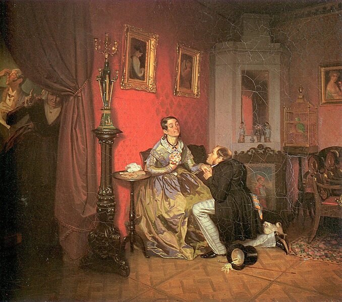 Говоря о прошлом, перед вами картина Павла Федотова "Разборчивая невеста", написанная в 1847 году. Это своеобразное злое зеркало, куда рекомендуется взглянуть чересчур разборчивым дамам.