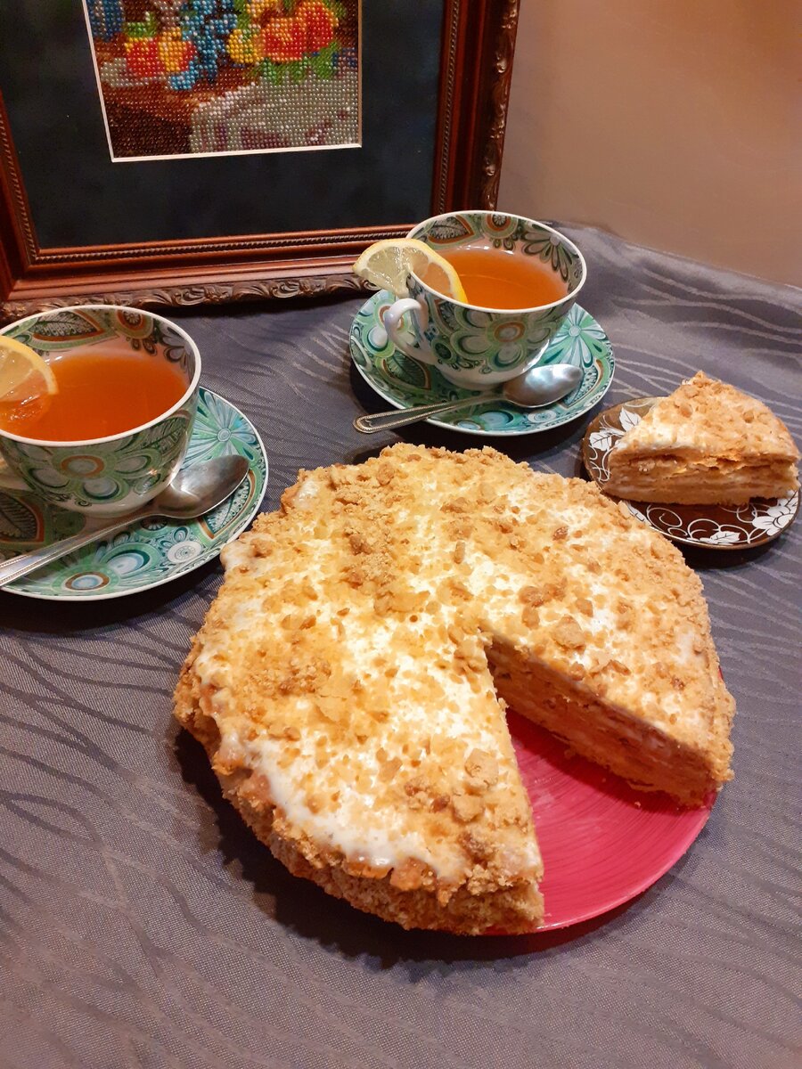 Здравствуйте, дорогие читатели и подписчики моего кулинарного канала. Сегодня я хочу поделиться с вами рецептом очень вкусного и нежного тортика. Мы в семье называем его "Рыжик", так как в состав теста входит мед и коржи получаются золотисто желтыми. Мед подходит любой цветочный, липовый, но я предпочитаю гречишный, с ним цвет у коржей получается еще более насыщенно "золотой". Итак процесс приготовления 3 столовые ложки молока, 2 столовые ложки меда, 1 столовая ложка сахарного песка и 1/2 пачки сливочного масла или маргарина растопить в кастрюльке на маленьком огне не давая закипеть Остудить и добавить 2 яйца, 1 чайную ложку соды и 2 стакана муки Замесить тесто и убрать в холодильник на 1,5 часа Тесто достать, разделить на четыре равные части и тонко раскатать. В хорошо разогретой духовке поочередно выпечь коржи. Пока коржи будут остывать можно приступить к приготовлению сметанного крема, а для этого нам понадобиться 1 стакан сметаны и 1\2 стакана сахара Сметану взбиваем с сахарным