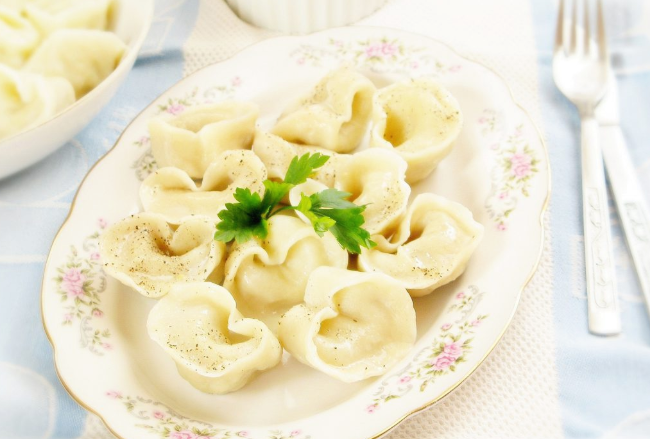 РУССКИЕ ПЕЛЬМЕНИ Очень популярен в Украине и России (Сибирь).Это небольшие пельмени с мясом. Также упоминается как Пельмени родом из Сибири. На языке уральцев пельмени означает «хлебный колос». Маленькие аппетитные пельмени едят в бульоне, увенчанные маслом или густыми сливками и слегка обсыпанные уксусом. Чтобы в полной мере оценить их неповторимый вкус, сибирский подгузник следует брать целиком. Мясная начинка свободно с отчетливой ноткой чеснока тает во рту. В оригинале предлагается несколько видов мяса для кормления, в основном баранина, свинина и говядина. (около 80 штук) ингредиенты: Набивка: - 500 г свинины - 500 г молотого баранины (вы также можете использовать говядину) - 1 яйцо - 2 луковицы - 3 зубчика чеснока - 1 столовая ложка майорана - около 1/3 стакана холодной воды или бульона - соль, перец Слоеное тесто: - 750 г муки + немного шлифования - около 1,5 стакана мл горячей воды - 4 столовые ложки масла - 1,5 чайных ложки соли КАК ПРИГОТОВИТЬ ПЕЛЬМЕНИ? Фарш : положит