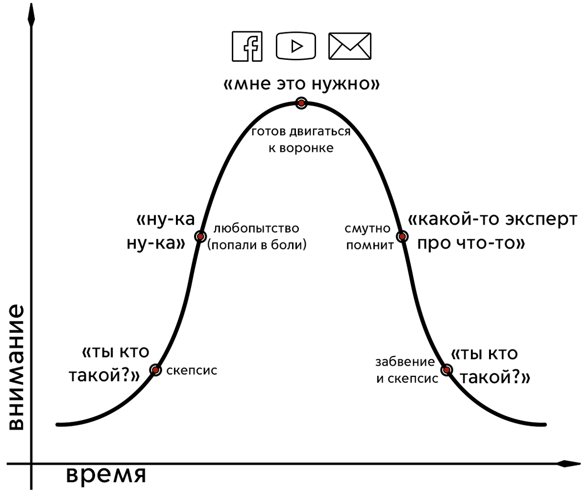 - Пик интереса («ну ничего себе, всё прямо как у нас! нам точно нужно то, о чем он говорит!»);